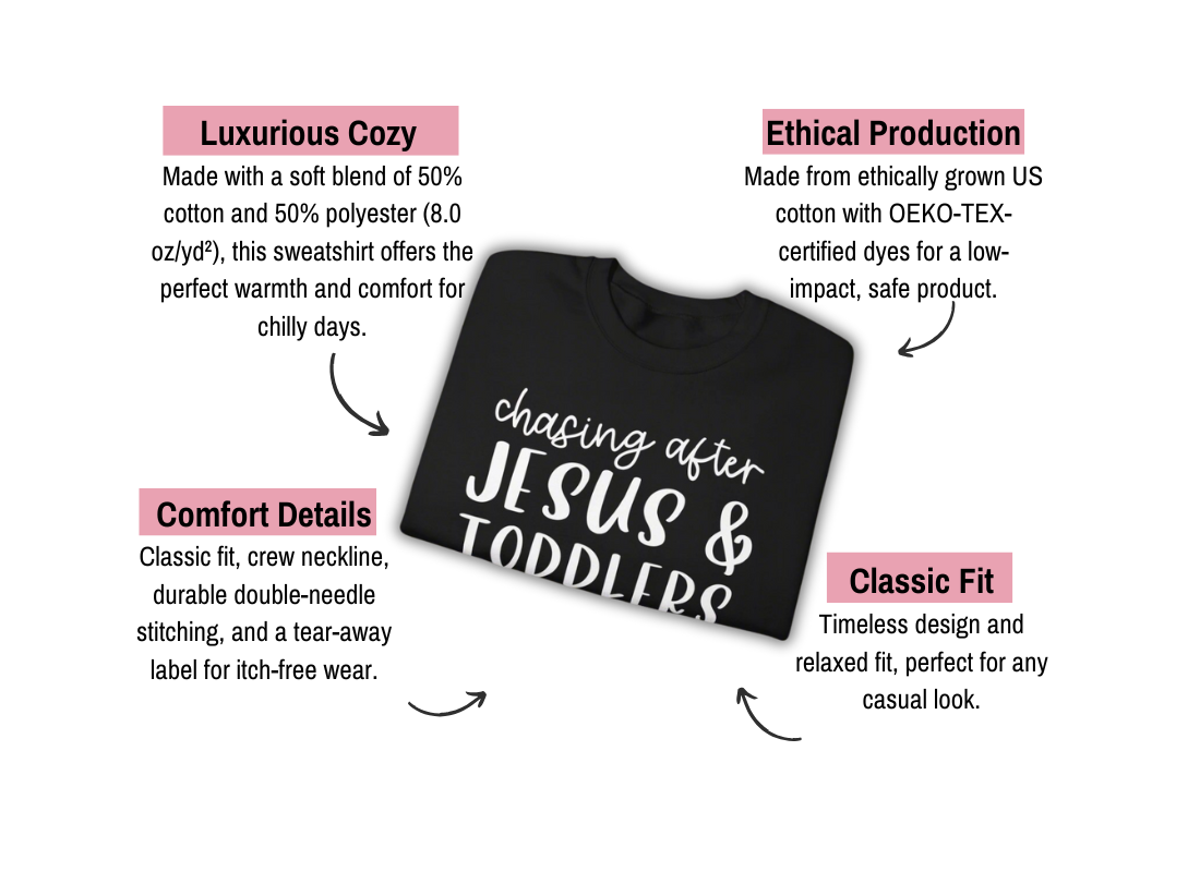 For the moms who are always on the go—both spiritually and physically! ✨ Our Chasing After Jesus & Toddlers Sweatshirt perfectly captures the beautiful chaos of motherhood, where faith and family come first. Cozy and soft, this sweatshirt keeps you comfortable as you navigate the daily adventures of raising little ones while staying rooted in your faith. It’s more than just clothing—it’s a statement of your devotion to both your kids and Jesus.